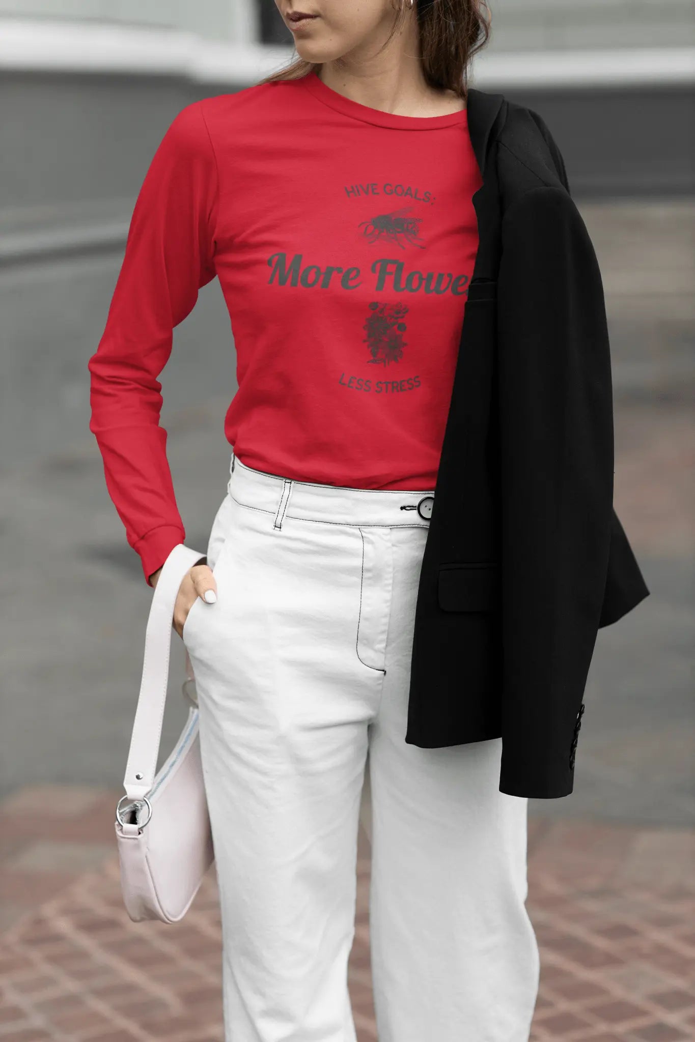 The Hive Goals More Flowers Less Stress Long Sleeve Tee embodies a philosophy of relaxation and well-being. With its comfortable fabric and stylish design, this tee encourages you to embrace a stress-free lifestyle. The message printed on the tee serves as a daily reminder to focus on your goals and enjoy the little joys of life, but it also highlights the importance of balance. When you wear this tee, you not only look good, but you also feel good, which is essential in our fast-paced world.