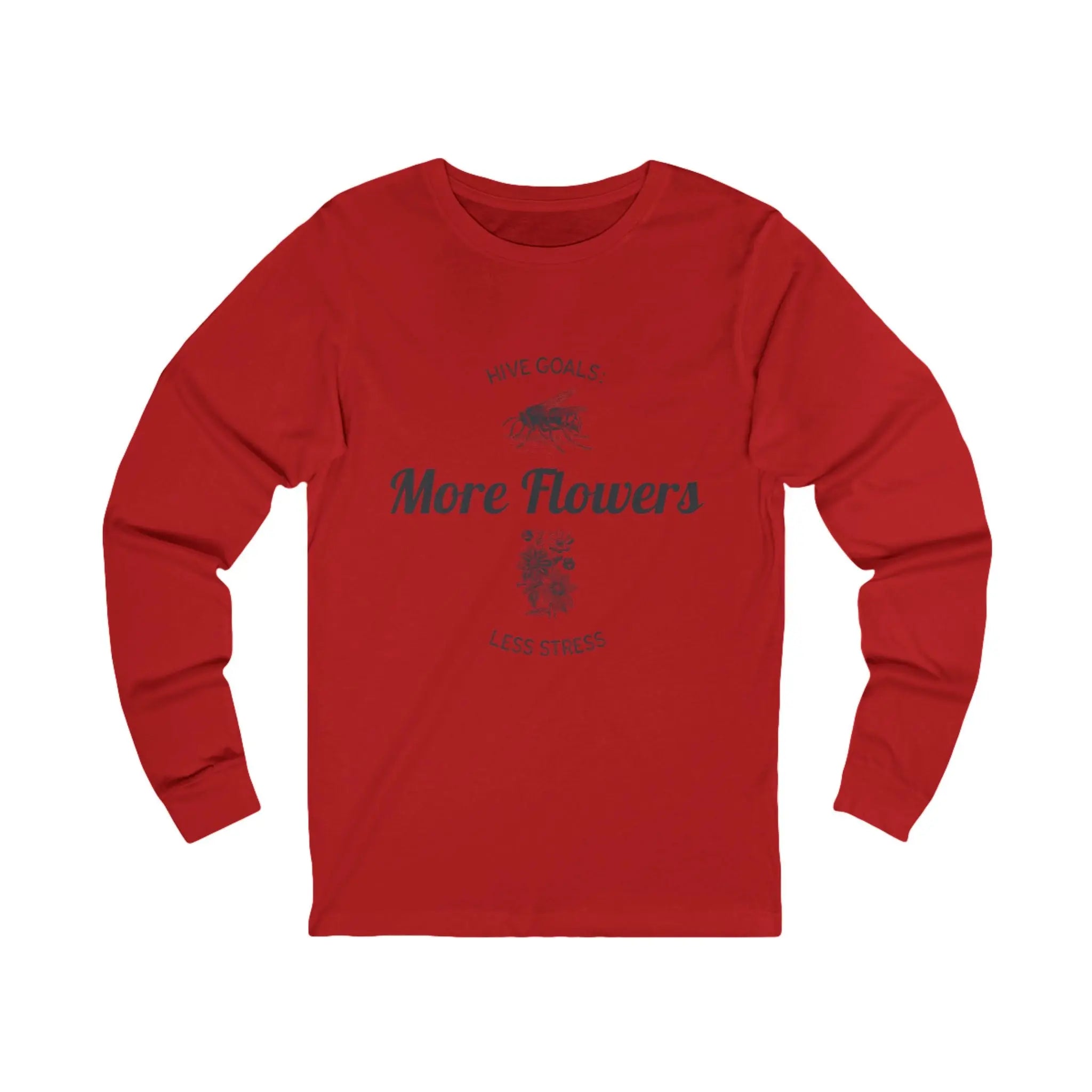 Stay motivated and stress-free with the 'Hive Goals More Flowers Less Stress' long sleeve tee. Perfect for those who love floral themes and positivity. Ideal for adults looking for comfort and style. Great for casual wear, lounging at home, or running errands. Suitable for gifting on birthdays, Mother's Day, and just to spread positivity.
