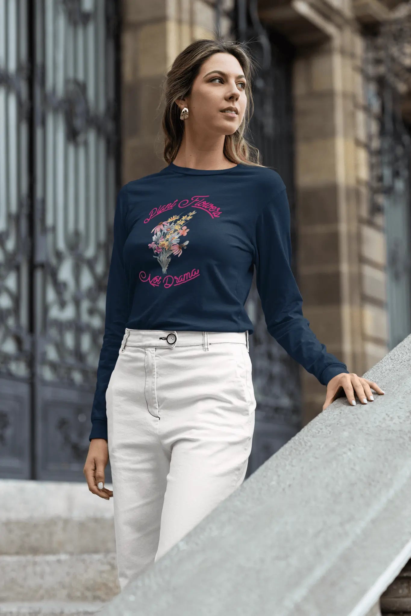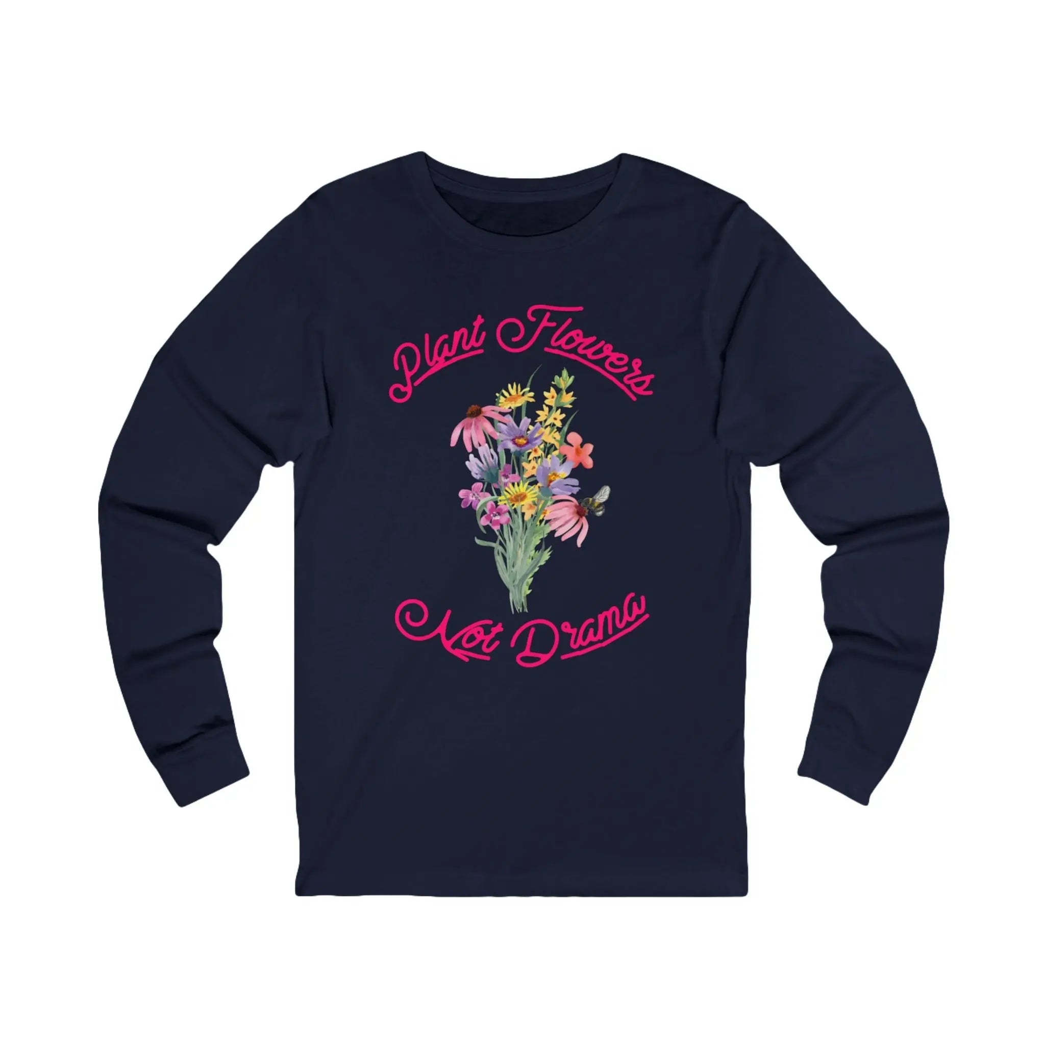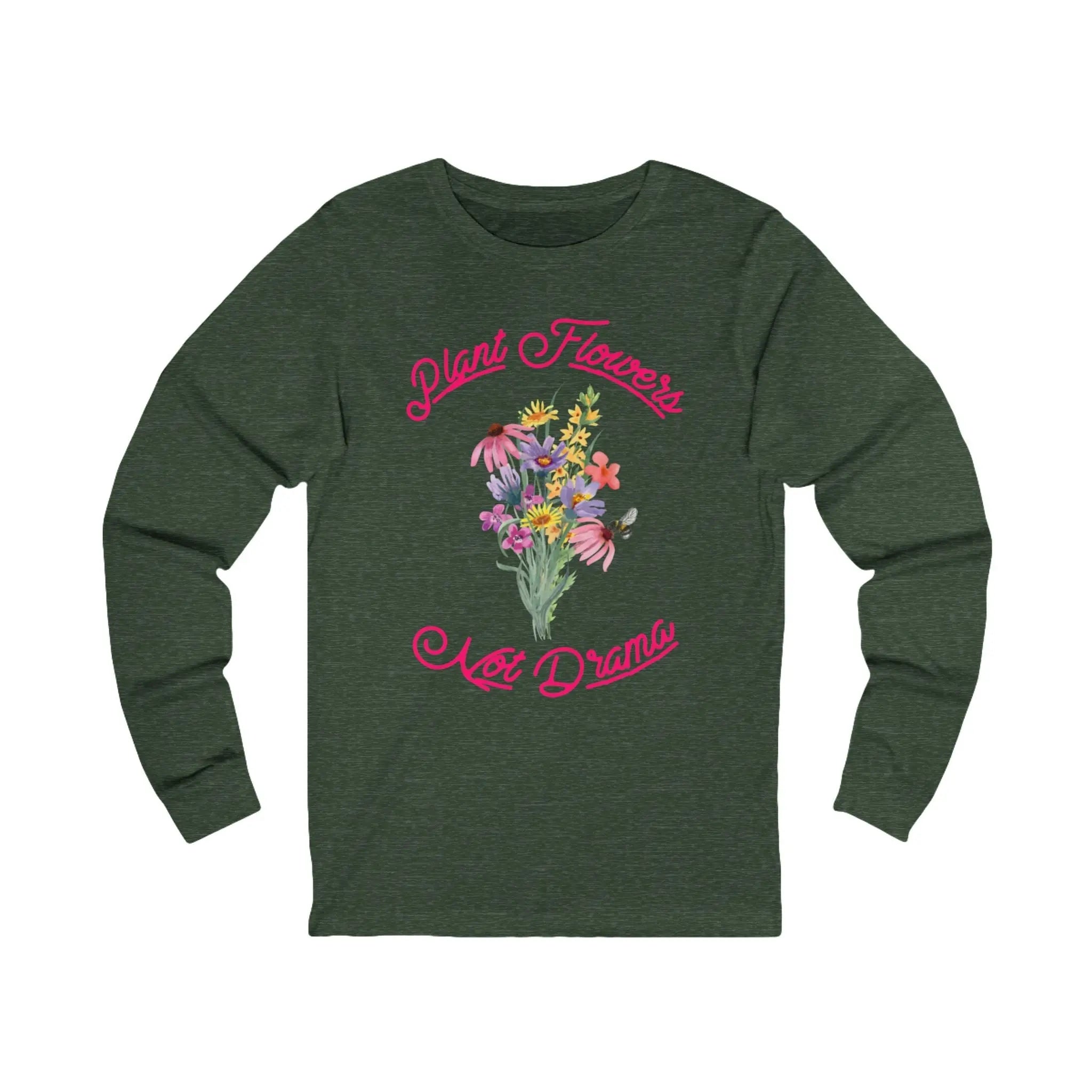 The Plant Flowers Not Drama Long Sleeve Tee exudes a peaceful and positive vibe, reminding you to focus on growth and positivity. Perfect for those who love plants and want to spread a message of peace. Ideal for wearing on casual days, gardening sessions, or yoga classes. Relevant for Earth Day, Peace Day, and everyday wear.